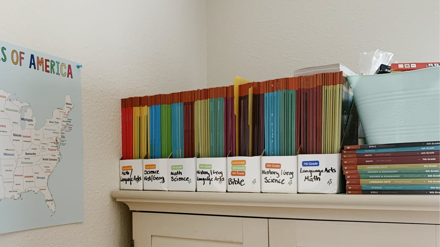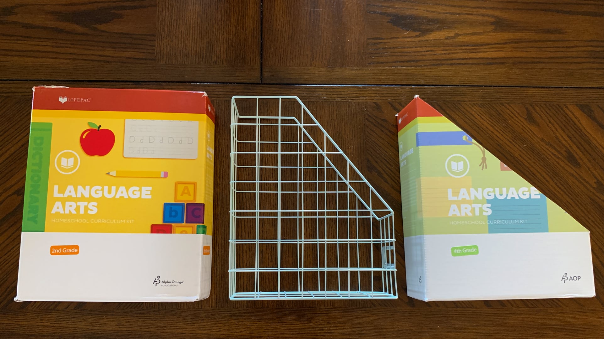 As this is our first time homeschooling, I did not have a classroom set up. Once all of our books arrived, I was very excited to get organized. My goal was to be able to see and access all the books easily. The subject boxes the worktexts arrive in were the perfect tool for this. There was no need to go out and buy anything new. I simply cut some of the boxes (above left) into the shape of a magazine holder (above right) using a utility knife.