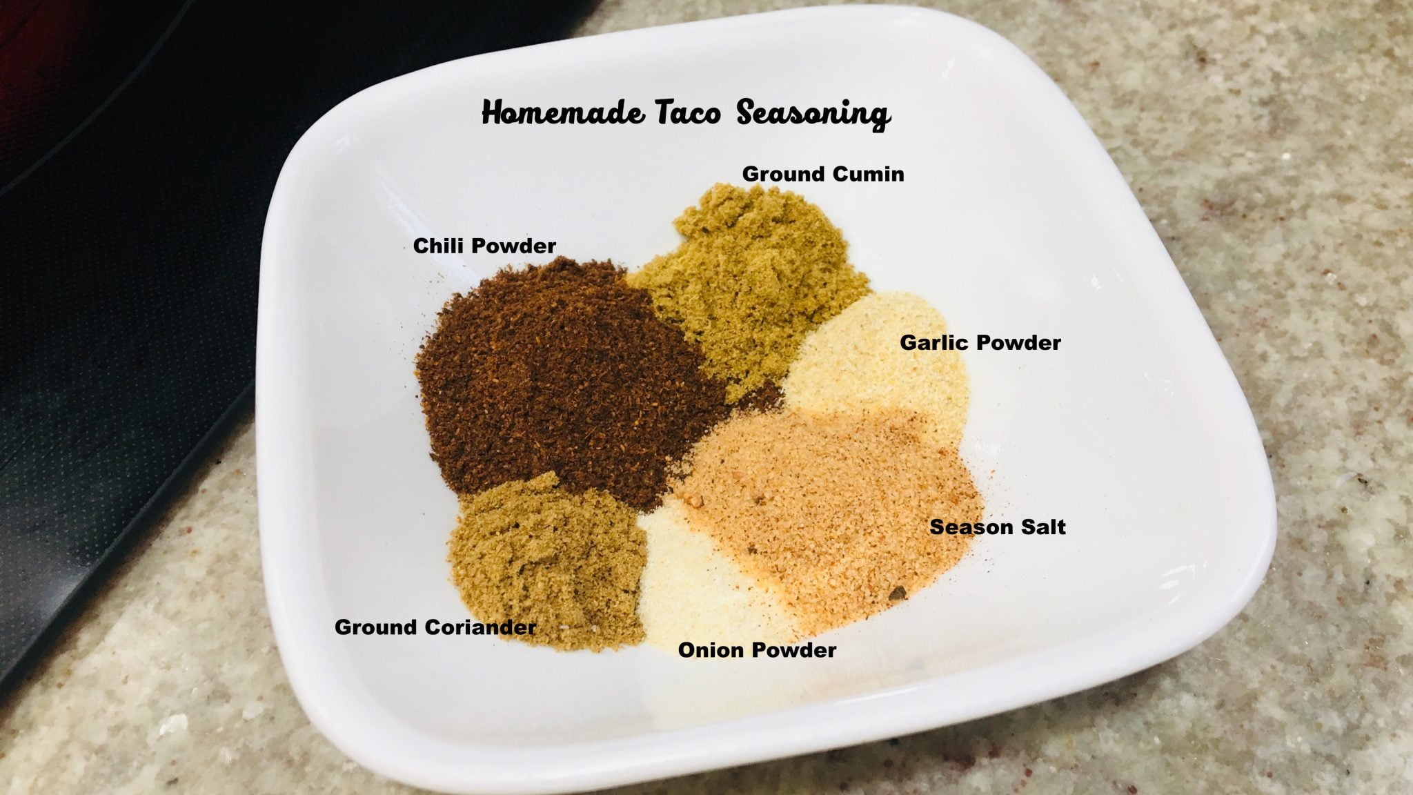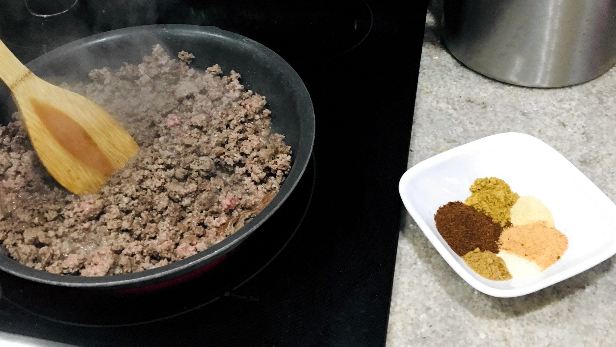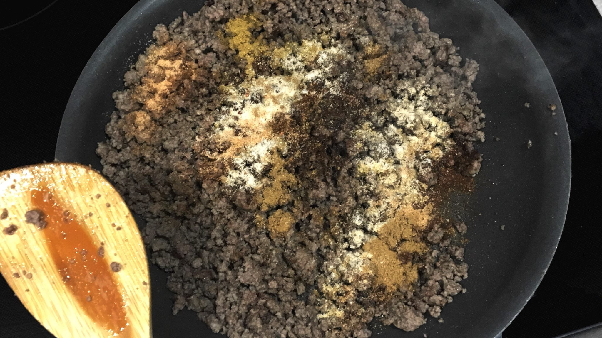 - While the beef is cooking, mix together taco seasoning in a separate bowl.