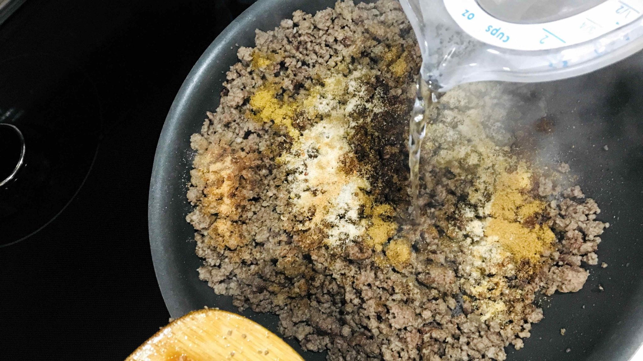 - After all the beef is browned, add the water and taco seasoning to the skillet with the meat. Stir and bring to a simmer. Simmer about 5 minutes, stirring occasionally, until the water is gone and the meat is seasoned.