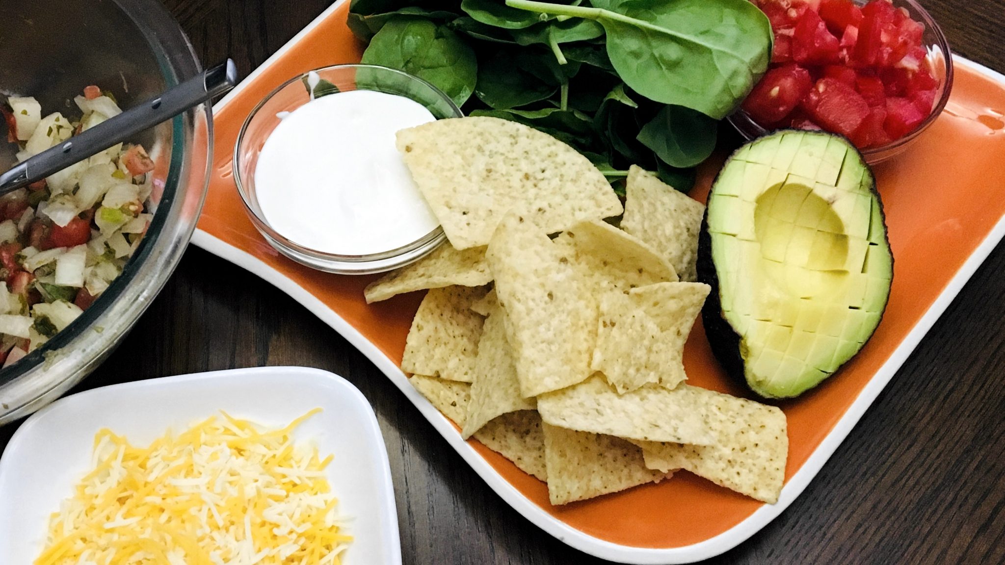 I actually like taco bowls more than regular tacos because the clean up is easier. I set up a taco bowl bar on my counter with all the taco toppings and mix-ins. Then, everyone makes up their bowl the way they want, and we enjoy a family meal together.