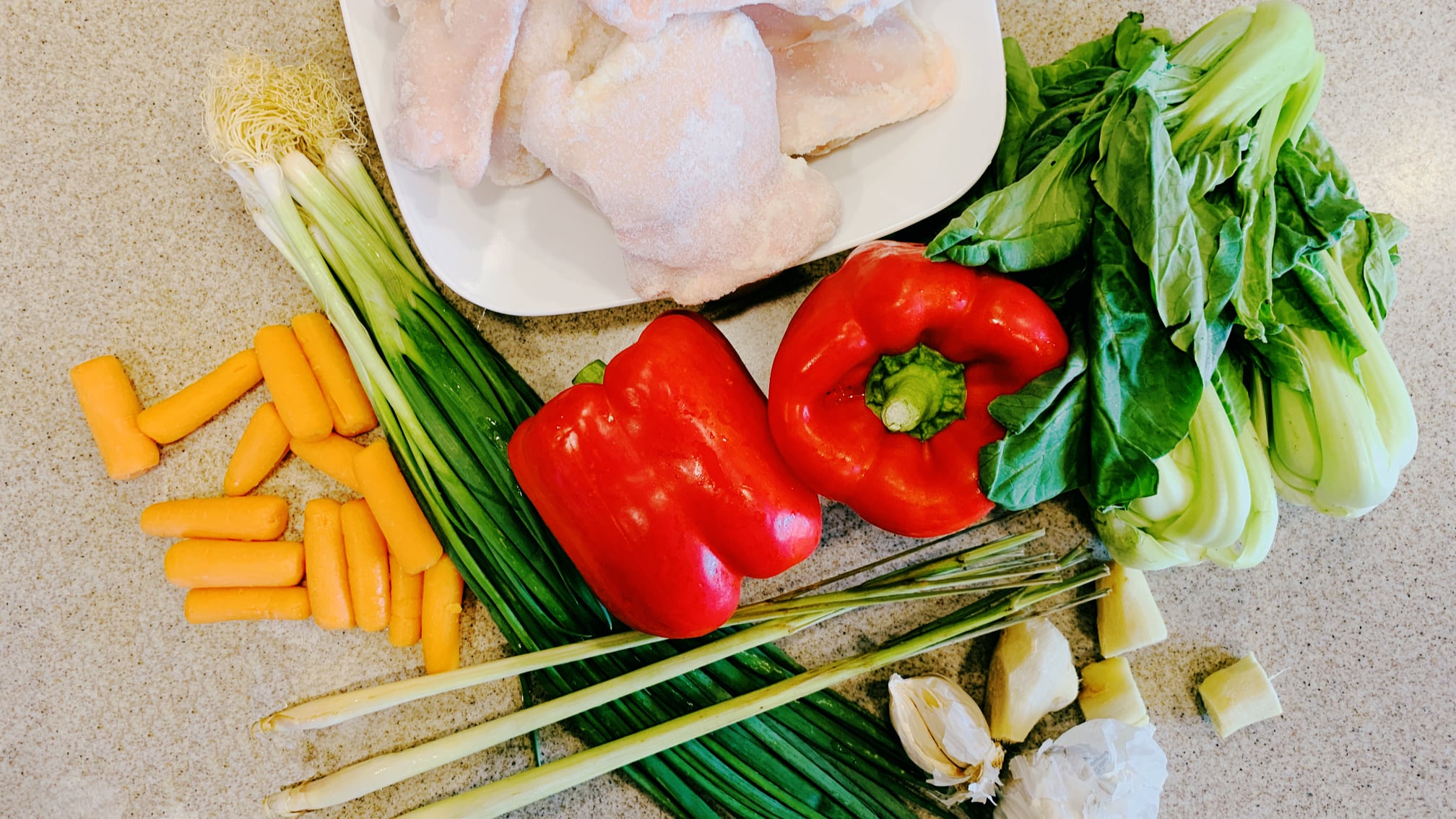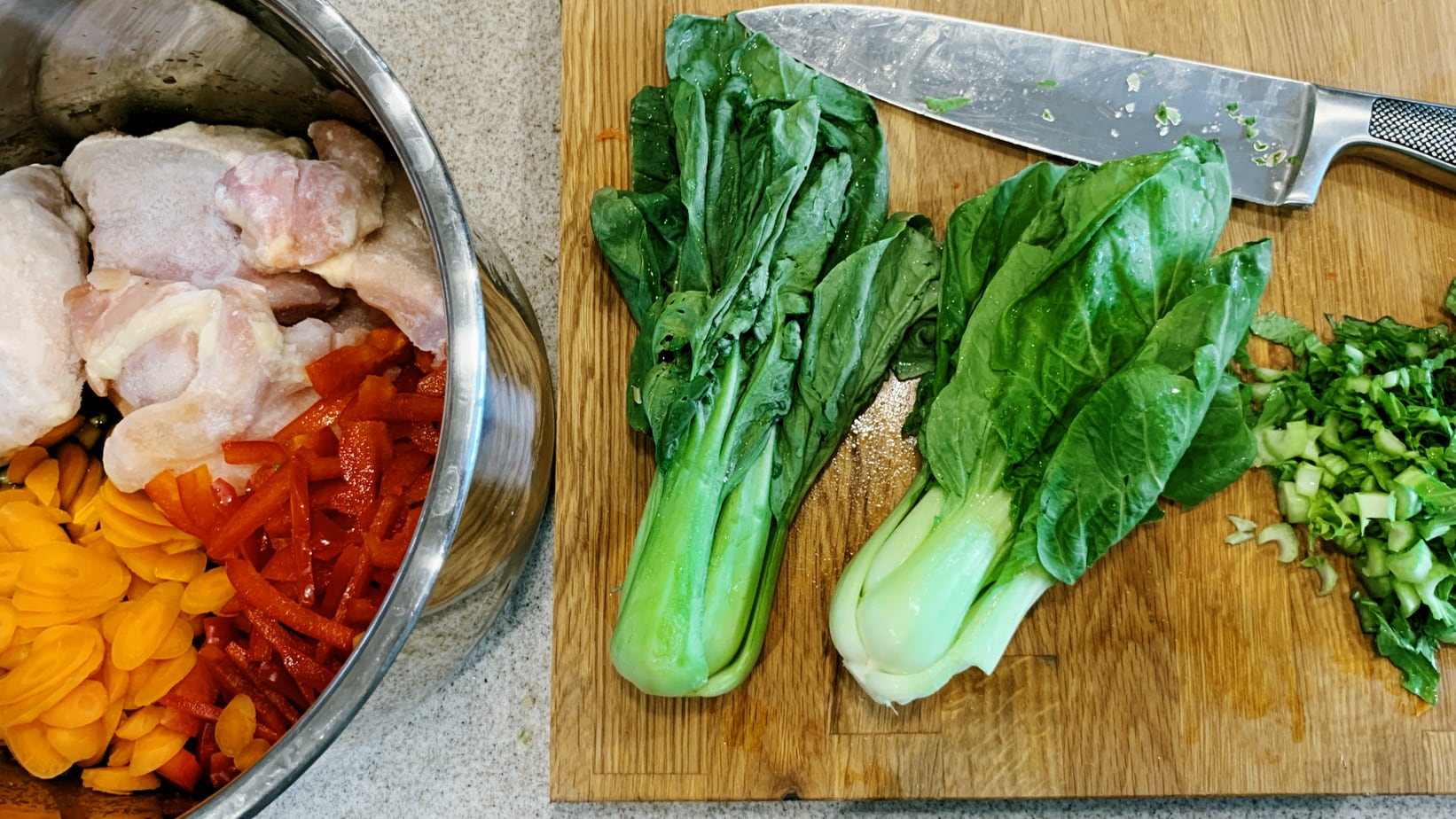 4. Slice the carrots, chop the bell pepper and slice the bok choy. Add these to pot along with the frozen chicken thighs and chicken stock.