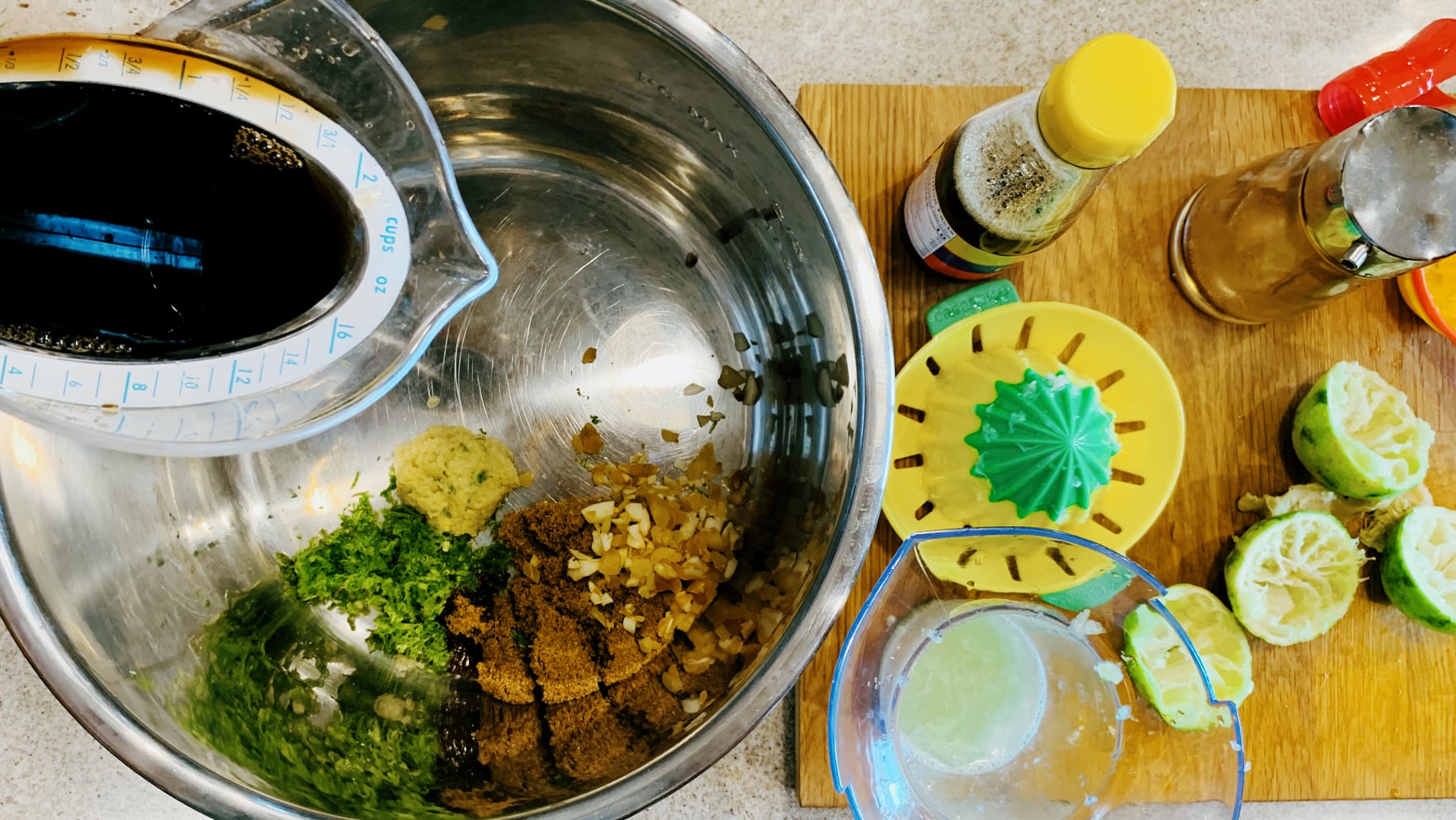 1. Mince the garlic. Juice and zest the limes. Grate the ginger. Inside the Instant Pot, whisk together the minced garlic, grated ginger, lime juice, lime zest, fish sauce, soy sauce and brown sugar blend.