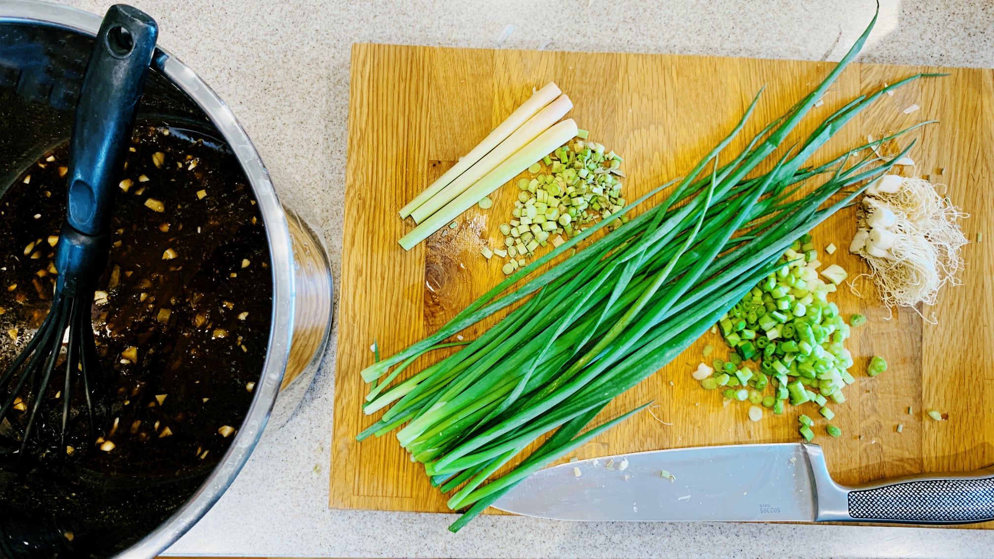 Now it’s time to add the lemongrass. If you’ve never worked with lemongrass, the stalks can be tough. So, cut off the woody tips and the root ends and throw them away. Finely slice the upper green stalk, and leave the tougher white stalk whole. Next, slice up a few green onions, discarding the roots and any limp leaves. Set aside some of the cut green onions for serving. Then, add the rest of the onions and all the sliced lemongrass to the mixture in the pot. Whisk everything together. Finally, add the whole white lemongrass stalks to the pot too. You’ll pull these out later, similar to adding bay leaves to your soup.