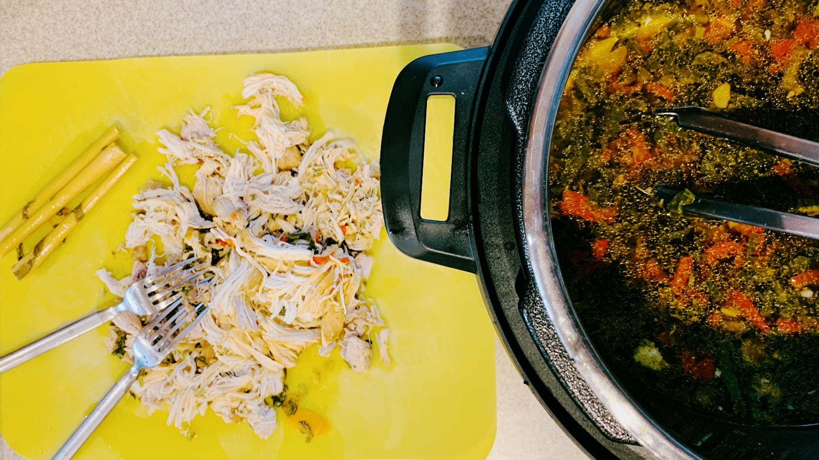 Once all of the ingredients are in the Instant Pot, it’s time for pressure cooking magic. Put the lid on your Instant Pot. Make sure the valve is set to “Sealing.” Then, pressure cook on Soup Mode for thirty minutes. You can release the pressure immediately, or let the soup keep warm until you’re ready. When it’s time to serve, remove the whole lemongrass stalks from the soup and throw them away. Then, take out the chicken, and shred it with two forks. Add the chicken back to the soup. Serve the soup sprinkled with the extra green onions as a garnish. Enjoy.