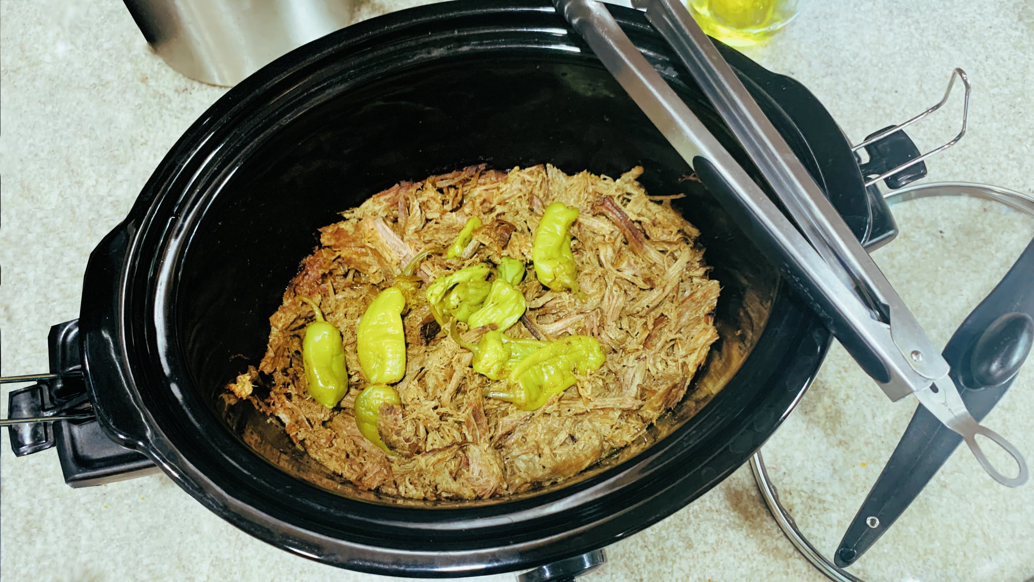 4. Before serving, shred the beef and toss with tongs in the juice at the bottom of the slow cooker. If you use whole pepperoncini, set them aside while shredding the meat. Or if you used sliced peppers, mix them in with the beef.  See notes on pepperoncinis above.