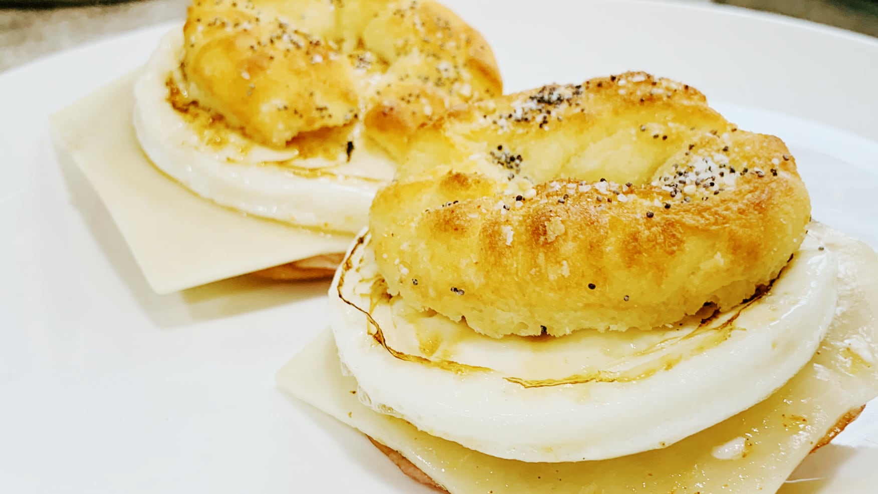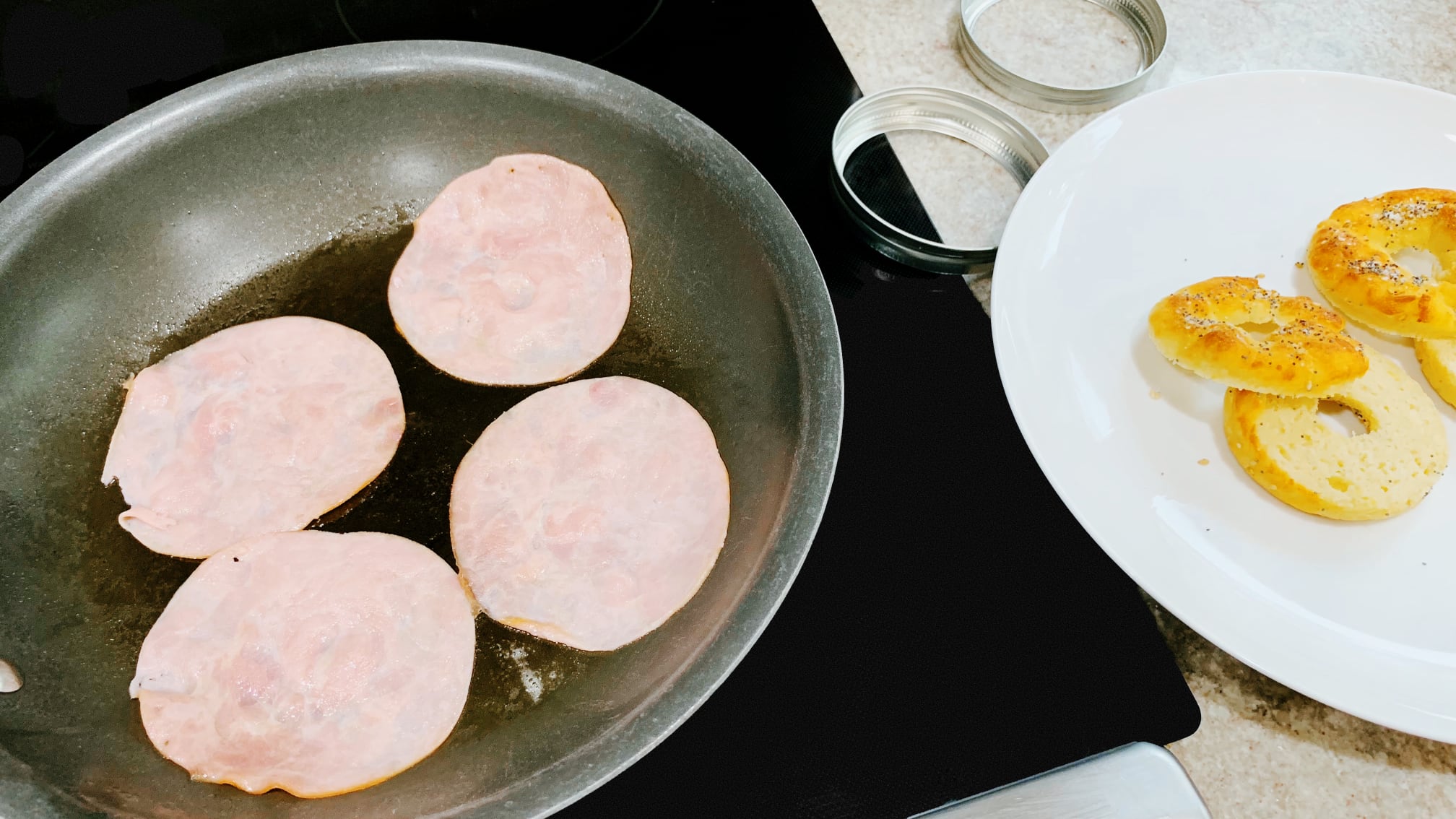 - When the ham is cooked to your liking, place 2 pieces on each bagel. Top the ham with one slice of cheese.
