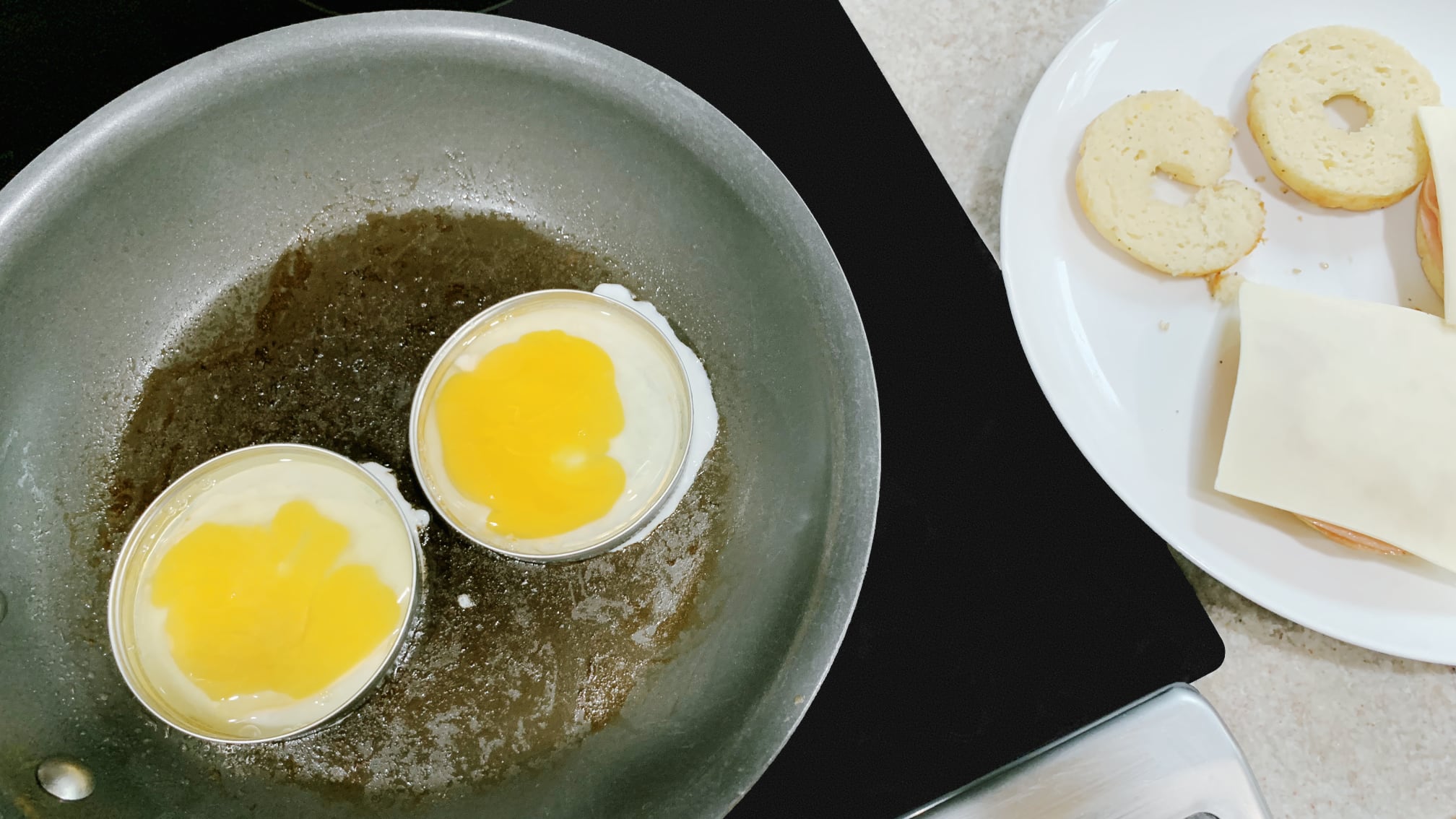 Use the same pan to cook the eggs as you did the ham. To keep you eggs is a circular shape, you can use an egg ring like these ones on Amazon. If you don’t have any egg rings, try some wide mouth canning rings. Whichever method you choose, spray the rings with non-stick spray and add them to the hot pan. Let the rings warm up for a minute. Then, add one egg to each ring. Break the yolk in the eggs and season with salt and pepper. Put a lid on the pan, and let the eggs cook for four to five minutes until they are cooked through.