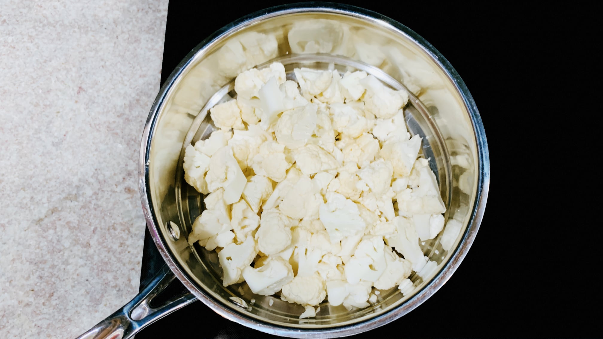 - Cut the cauliflower into bite sized pieces. Place the cauliflower in a steamer pot on the stove. Once the water starts boiling, put the lid on the pot. When the cauliflower has steamed for 5 minutes, remove it from the heat. Rinse the cauliflower with cold water, and let it drain.
