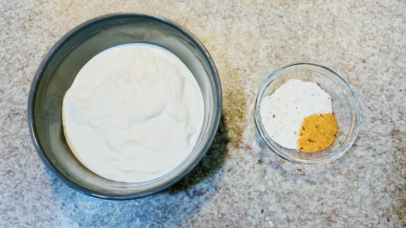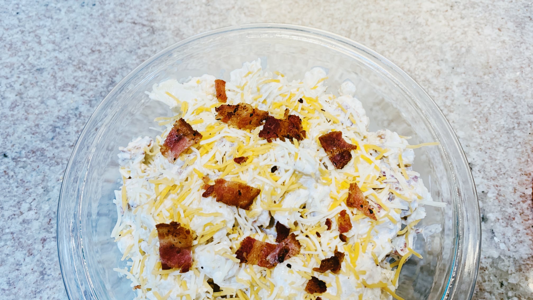 - In a large mixing bowl, mix together the sour cream, ranch powder and season salt. Chop the cooked bacon, and add it to the bowl along with the shredded cheese.