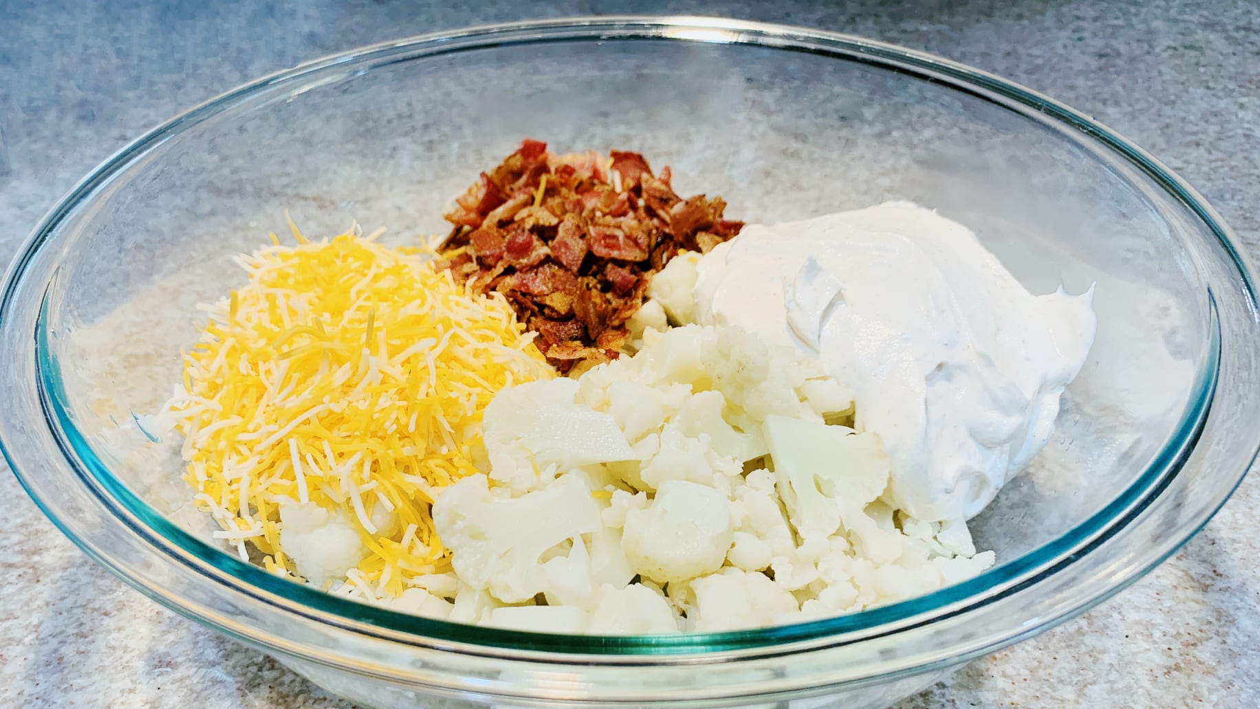 - Add the drained cauliflower to the mixing bowl. Stir all the ingredients together. Store in the refrigerator until ready to serve.