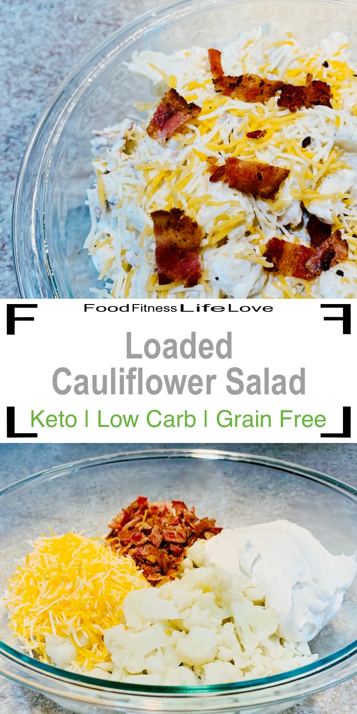 A quick recipe for loaded cauliflower salad with bacon, cheese and creamy ranch makes an easy low carb side dish everyone will enjoy.