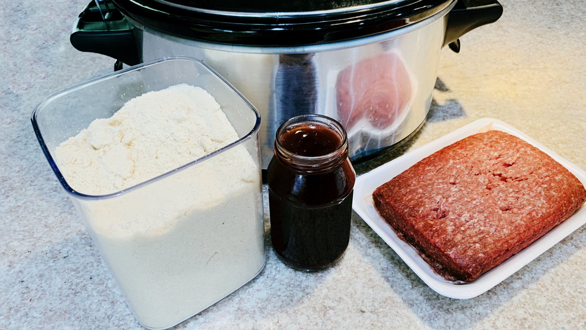 The final component for this quick recipe is the sauce. So, add all of the sauce ingredients to your slow cooker. You’ll need one jar of sugar-free grape jelly, a can of tomato paste, Worcestershire, molasses, dry mustard powder, onion powder, garlic powder, chili powder and a little water. Then, just whisk everything together, and the sauce is done.