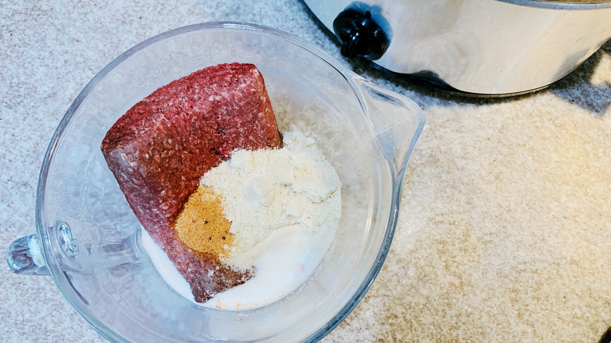 For this recipe, we’re going to start with the meatballs. You could use store bought frozen meatballs for this recipe. However, you’ll often find that they contain bread or bread crumbs. In fact, most meatball recipes do include bread. Therefore, in this recipe we’ll swap out the bread for low carb almond flour. The meatballs are so easy to make. It’s almost as quick as using frozen. First, put lean ground beef in a large bowl or measuring cup. Then, add milk, almond flour and seasoning salt. Finally, mix everything together until it’s just combined. It’s important not to over-mix the meat, or it will become tough.