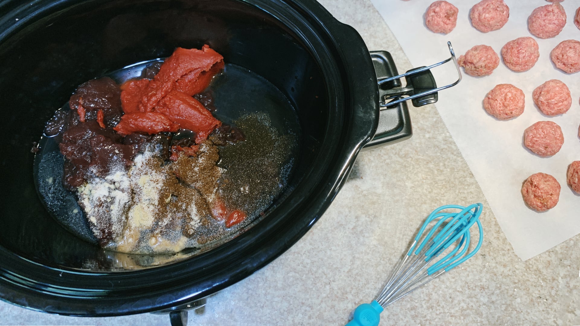 - In the slow cooker, combine the grape jelly, water, tomato paste, molasses, Worcestershire, dry mustard, onion powder, garlic powder and chili powder. Whisk everything together until the sauce is smooth.