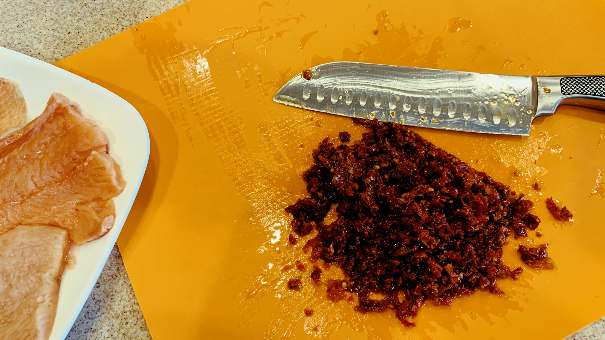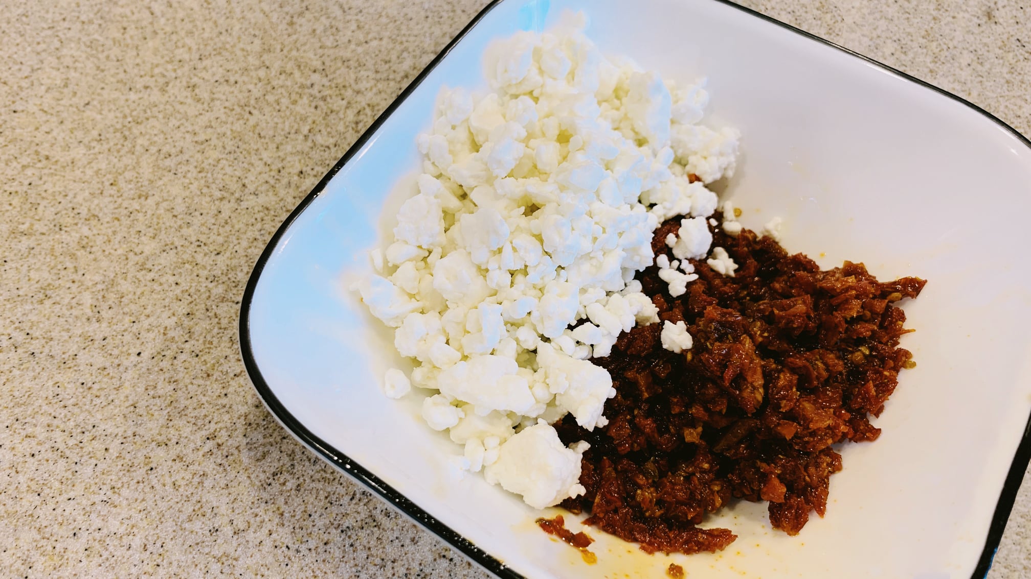 - While the pan is heating up, finely mince the sun-dried tomatoes. Add them to a bowl with the feta cheese, mix together and set aside.