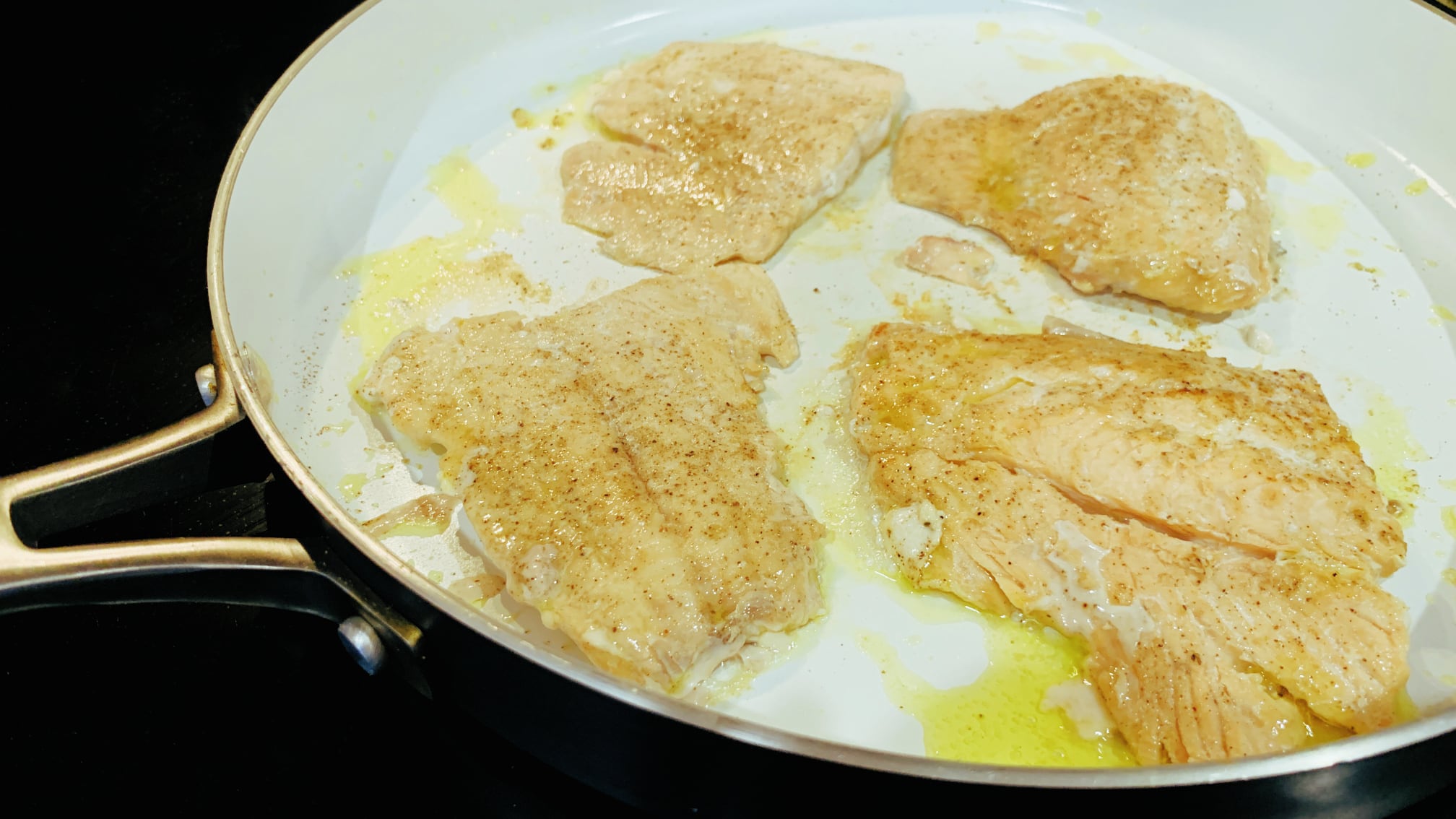 - When the pan is hot, add the olive oil and swirl to coat the pan. Put the seasoned salmon fillets in the pan. Cook the salmon about 5 minutes, and then flip the fillets over. Cook another 3-5 minutes until the salmon is opaque and flakes easily.