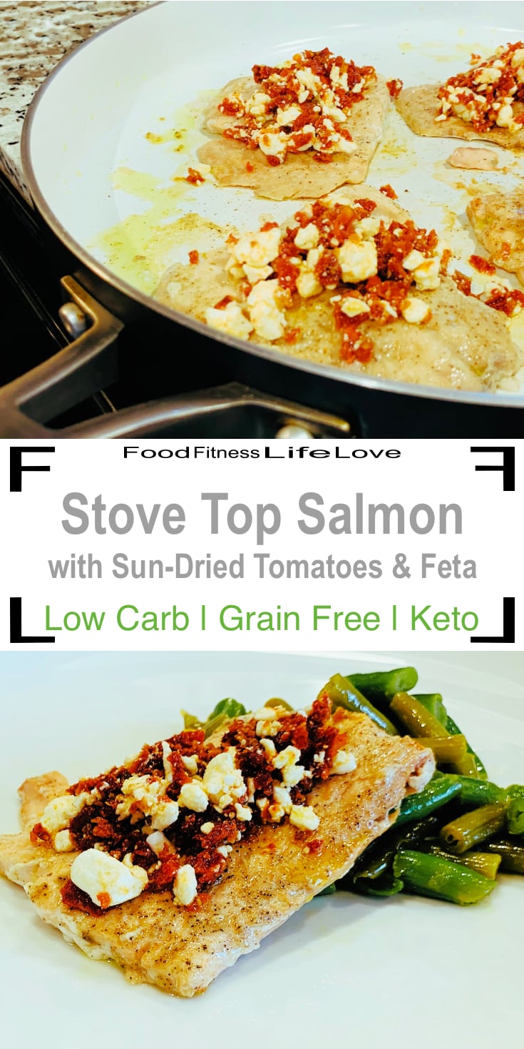 A quick and easy weeknight dinner, this stove top salmon recipe is delish topped with tangy sun-dried tomatoes and salty feta cheese.
